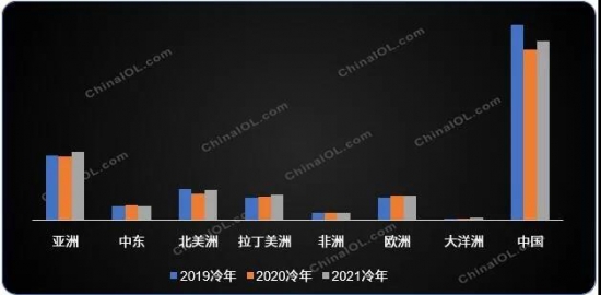 2021冷年,在疫情后需求逐步修复、部分国家天气炎热、全球经济持续复苏的背景下,全球家用空调的容量较2020冷年有显著改善。但从细分区域的表现来看,各区域之间还是存在明显差异。