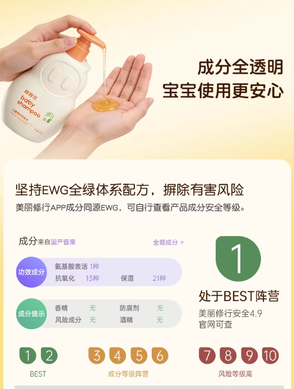 配方实力:必须采用儿童专属温和清洁体系,无硫酸盐、无皂基、无人工香精、无色素、无刺激性防腐剂,核心成分有明确的安全背书,配方精简透明,科学复配兼顾清洁、舒缓、保湿、修护四大核心需求,适配儿童仅为成人1/3厚度的头皮角质层。